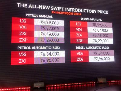 नेक्स्ट जेनरेशन स्विफ्ट की एक्स-शोरूम (दिल्ली) कीमत 4.99 लाख रुपये से शुरू हो रही है। कार में पेट्रोल और डीजल के चार वैरिएंट उपलब्ध हैं। पेट्रोल में LXi, Vxi, ZXi, ZXi+ और डीजल में LDi, VDi, ZDi, ZDi+ वैरिएंट हैं। इन सभी वैरिएंट की कीमत आपने नीचे दिए चार्ट में देख सकते हैं।