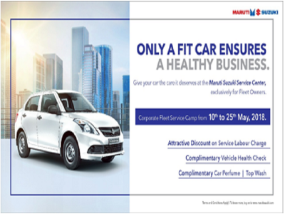 देश की अग्रणी कार निर्माता कंपनी कॉर्पोरेट फ्लीट और टैक्सी के लिए एक सर्विस कैंप का आयोजन कर रही है। ये कैंप पूरे देश में 10 मई से लेकर 25 मई 2018 के बीच चलाया जाएगा। ये एक फ्री व्हीकल हेल्थ चेकअप कैंप है जिसका आयोजन Maruti Suzuki के देशभर में फैले 2000 से ज्यादा सर्विस वर्कशॉप पर किया जाएगा।