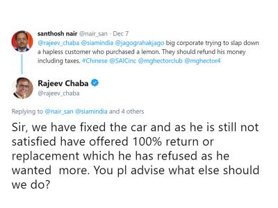 बाद में जब लोगों ने सोशल मीडिया में एमजी और उसके अधिकारियों से इससे जुड़े सवाल पूछने लगे और वीडियो शेयर करने लगे तो मामला बढ़ता देख कंपनी ने कार के रिप्लेसमेंट और रिटर्न की बात कही।