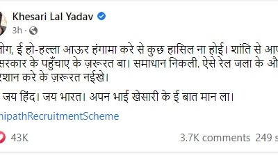 फेसबुक पोस्ट में खेसारी ने लिखा- भाइयों, इस हो हल्ले और हंगामे से कुछ हासिल नहीं होनेवाला। शांति से सरकार तक अपनी बात पहुंचाने की जरूरत है। समाधान निकलेगा। ऐसे ट्रेन जलाकर लोगों को परेशान करने की जरूरत नहीं है। बाकी जय हिंद। जय भारत। अपने भाई खेसारी का यह बात मान लें।
