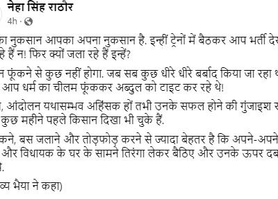 नेहा ने फेसबुक पोस्ट में लिखाः रेलवे का नुकसान आपका अपना नुकसान है. इन्हीं ट्रेनों में बैठकर आप भर्ती देखने जाते रहे हैं न! फिर क्यों जला रहे हैं इन्हें? अब ट्रेन फूंकने से कुछ नहीं होगा। जब सब कुछ धीरे धीरे बर्बाद किया जा रहा था तब तो आप धर्म का चीलम फूंककर अब्दुल को टाइट कर रहे थे!