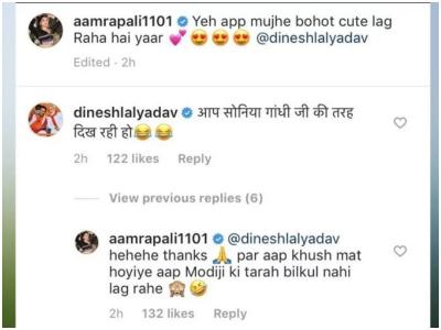 दोनों की ये फोटो फैंस के बीच छा गई है। दोनों के ही फैंस इनके इस अंदाज को खासा पसंद कर रहे हैं और इस पर कमेंट कर रहे हैं। कमेंट करने से पीछे खुद आम्रपाली और निरहुआ भी पीछे नहीं रहे हैं। निरहुआ ने लिखा है कि आप सोनिया गांधी जी की तरह दिख रही हैं। वहीं जवाब में आम्रपाली ने लिखा है कि हाहा शुक्रिया, लेकिन आप खुश मत हो, क्योंकि आप मोदी जी की तरह बिल्कुल नहीं दिख रहे हैं।