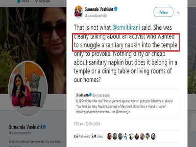 लेकिन मीडिया रिपोर्ट्स के मुताबिक, स्मृति का ये बयान एक फेक न्यूज पर आधारित है। जी हां, कुछ दिनों पहले सोशल मीडिया पर एक फेक न्यूज वायरल हुई, कि फेमिनिस्ट एक्टिविस्ट रेहाना फातिमा खून से सना सैनिटरी नैपकिन लेकर सबरीमाला मंदिर गई थीं, और उन्होंने अपने दोस्त के साथ प्लानिंग की थी कि वह मंदिर के देवता अयप्पा पर ये पैड फेकेंगी, हालांकि फतिमा ने इस खबर को सिरे से नाकार दिया था।