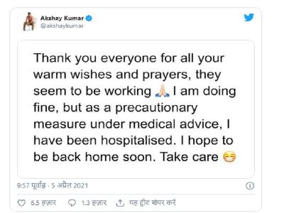 बॉलीवुड स्टार अक्षय कुमार ने रविवार को बताया था कि वे कोरोना संक्रमित हो गए हैं। अब ये जानकारी सामने आई है कि उन्हें अस्पताल में भर्ती कराया गया है।