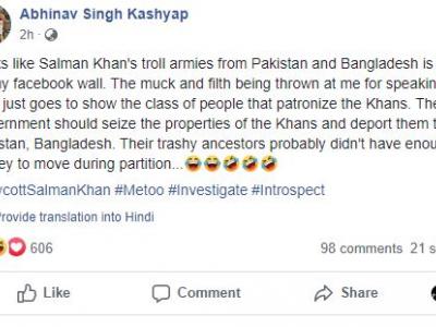 अभिनव सिंह कश्यप ने अपने पोस्ट में लिखा, 'लगता है कि पाकिस्तान और बांग्लादेश से सलमान खान की ट्रोल सेना वापस मेरी फेसबुक वॉल पर आ गई है। सच बोलने के लिए मुझ पर फेंका गया मैल और गंदगी केवल इन लोगों के क्लास को दर्शा रहा है। ये वो लोग हैं, जिन्हें खान्स का संरक्षण प्राप्त है। सरकार को खान्स की संपत्तियों को जब्त करना चाहिए और उन्हें पाकिस्तान, बांग्लादेश भेज देना चाहिए। उनके कचरा पूर्वजों के पास शायद विभाजन के दौरान स्थानांतरित करने के लिए पर्याप्त पैसा नहीं था।'