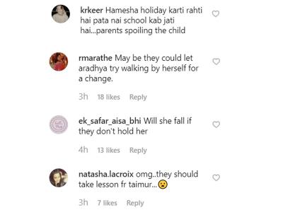 ऐसे में इस बार भी सामने आए वीडियो पर आराध्या को ट्रोल कर दिया गया है। एक यूजर ने कमेंट करके लिखा है कि शायद ये आराध्या को अपने आप चलने का एक मौका दें।यूजर ने कमेंट किया कि क्या अगर ये आराध्या को पकड़कर नहीं रखेंगे तो वो गिर जाएंगी? तो वहीं एक अन्य यूजर ने कमेंट किया कि हमेशा हॉलीडे करती रहती है पता नहीं स्कूल कब जाती है।