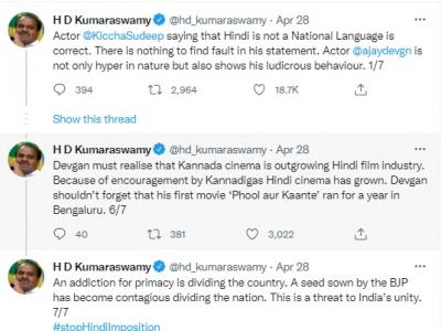 कुमारस्वामी ने कहा कि हिंदी भी हमारी भाषाओं में से एक है। एक अन्य ट्वीट में कुमारस्वामी ने कहा कि कन्नड़, तेलुगु, तमिल, मलायालम और मराठी की तरह हिंदी भी हमारी भाषाओं में से एक है। पूर्व मुख्यमंत्री ने कहा कि "सिर्फ इसलिए कि एक बड़ी आबादी हिंदी बोलती है, ये राष्ट्रीय भाषा नहीं बन जाती है। 9 से कम राज्यों, हिंदी कश्मीर-कन्याकुमारी में दूसरी, तीसरी भाषा के रूप में है या वो भी नहीं है। ये स्थिति होने पर अजय देवगन के बयान में क्या सच्चाई है? डब न करने से आपका क्या मतलब है?"