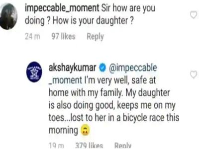 हाल ही में अक्षय कुमार ने अपने इंस्टाग्राम पर एक पोस्ट किया, जिसपर फैन ने उनसे सवाल पूछते हुए लिखा कि सर, आप कैसे हैं और आपकी बेटी कैसी है? अक्षय कुमार ने बिना देर किए ही फैन को जवाब दिया। अक्षय ने लिखा, 'मैं अच्छा हूं, घर पर सुरक्षित हूं, परिवार संग हूं। मेरी बेटी भी अच्छी है और वह मुझे रोज नया टास्क देती है। अभी सुबह ही उसने मुझे साइकिल रेस में हराया है।