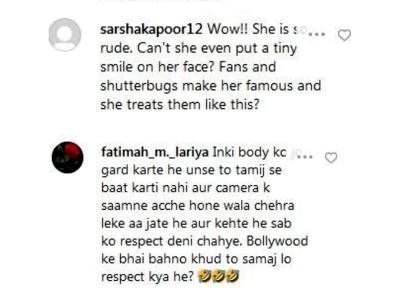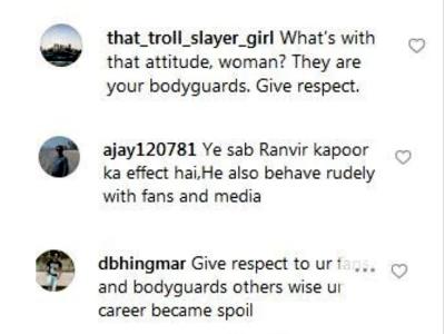आलिया के एक फैन ने लिखा, ये कैसा बर्ताव है वो तुम्हारे बॉडीगार्ड हैं उन्हें रिस्पेक्ट दीजिए। वहीं दूसरे फैन ने लिखा, ये सब रणबीर कपूर का इफेक्टर है, वो भी अपने फैंस और मीडिया के साथ ऐसे ही बर्ताव करते है। सिर्फ यही नहीं बहुस से फैंस ने आलिया के इस बिहेवियर को गलत बताया है।