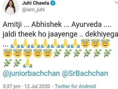 मामला अधिक बढ़ने पर जूही चावला ने इस ट्वीट को डिलीट कर दिया। इसके बाद उन्होंने एक और ट्वीट किया। जूही ने लिखा, 'अमितजी, अभिषेक, ऐश्वर्या और आराध्या, आप सभी के जल्द स्वस्थ होने की दुआ मांगते हैं। मेरे इससे पहले वाले ट्वीट में कोई गलती नहीं थी। जब मैंने आयुर्वेद लिखा तो वहां उसका मतलब था कि प्राकृति आप सभी को जल्द ठीक करेगी।'