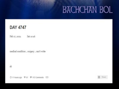साथ ही इस बारे में भी जानकारी नहीं मिल सकती है कि 78 वर्षीय अमिताभ बच्चन की सर्जरी हो चुकी है या होने वाली है। उन्होंने शनिवार रात अपनी पोस्ट में केवल एक लाइन लिखी है। उन्होंने लिखा, 'मेडिकल कंडीशन...सर्जरी...कुछ और नहीं लिख सकता।' इस पोस्ट के बाद अमिताभ बच्चन के फैंस उनके अच्छे स्वास्थ्य की कामना कर रहे हैं।
