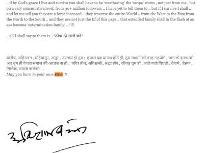 मेरी तरफ से नहीं बल्कि मेरे 90 मिलियन फॉलोअर्स की तरफ से, और ये जान लो कि ये दुनिया भर में हैं। हर कौने में, ईस्ट से लेकर वेस्ट तक, नॉर्थ से लेकर साउथ तक और ये केवल इस पेज की ईएफ यानी एक्सटेंडेंड फैमिली नहीं है बल्कि एक्सटर्मिनेशन फैमिली है।'' अमिताभ ने लिखा, ''मारीच, अहिरावन, महिषासुर, असुर, उपनाम हो तुम; हमारा यज्ञ प्रारंभ होते ही, तुम राक्षसों की तरह तड़पोगे। जान लो इतना कि अब तुम ही केवल समाज की आवाज ना हो; चरित्रहीन, अविश्वासी, श्रद्धाहीन, लीचड़ तुम हो; जलो गलो पिघलो, बेशर्म, बेहया, निर्लज्ज, समाज कलंकी।'' अंत में उन्होंने यह भी लिखा, ''आप अपनी व्याकुलता में जल सकते हैं!''