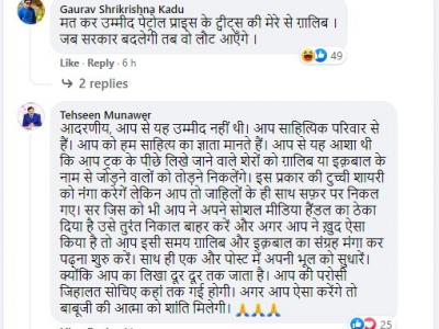एक यूजर ने लिखा- आदरणीय, आप से यह उम्मीद नहीं थी। आप साहित्यिक परिवार से हैं। आप को हम साहित्य का ज्ञाता मानते हैं। आप से यह आशा थी कि आप ट्रक के पीछे लिखे जाने वाले शेरों को ग़ालिब या इक़बाल के नाम से जोड़ने वालों को तोड़ने निकलेंगे। इस प्रकार की टुच्ची शायरी को नंगा करेगें लेकिन आप तो जाहिलों के ही साथ सफ़र पर निकल गए। सर जिस को भी आप ने अपने सोशल मीडिया हैंडल का ठेका दिया है उसे तुरंत निकाल बाहर करें और अगर आप ने ख़ुद ऐसा किया है तो आप इसी समय ग़ालिब और इक़बाल का संग्रह मंगा कर पढ़ना शुरु करें।