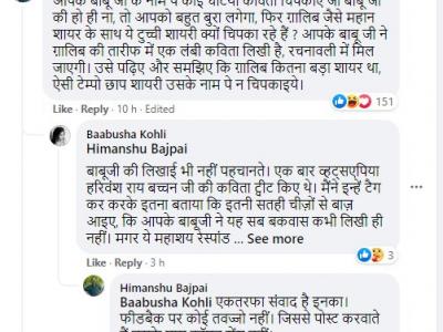 इसके साथ ही लखनऊ के किस्सागो और लेखक हिमांशु बाजेपेयी ने अमिताभ बच्चन को अपने पिता की एक कविता को पढ़ने की सलाह दी जिसे उन्होंने ग़ालिब की तारीफ में लिखी थी। हिमांशु बाजेपीय ने कमेंट किया-आपके बाबू जी के नाम पे कोई घटिया कविता चिपकाए जो बाबू जी की हो ही ना, तो आपको बहुत बुरा लगेगा, फिर ग़ालिब जैसे महान शायर के साथ ये टुच्ची शायरी क्यों चिपका रहे हैं ? आपके बाबू जी ने ग़ालिब की तारीफ में एक लंबी कविता लिखी है, रचनावली में मिल जाएगी। उसे पढ़िए और समझिए कि ग़ालिब कितना बड़ा शायर था, ऐसी टेम्पो छाप शायरी उसके नाम पे न चिपकाइये। इसके साथ ही हिमांशु ने बिग बी पर एकतरफा संवाद करने जैसी बात कही। लिखा-एकतरफा संवाद है इनका। फीडबैक पर कोई तवज्जो नहीं। जिससे पोस्ट करवाते हैं उसके पास कॉमन सेंस नहीं।