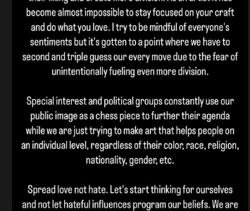 उन्होंने ये भी लिखा, "विशेष हित और राजनीतिक समूह अपने एजेंडे को आगे बढ़ाने के लिए लगातार हमारी (कलाकारों की) सार्वजनिक छवि को शतरंज के मोहरे के रूप में उपयोग करते हैं, जबकि हम सिर्फ ऐसी कला बनाने की कोशिश कर रहे हैं जो लोगों को व्यक्तिगत स्तर पर मदद करती है, चाहे उनका रंग, नस्ल, धर्म, राष्ट्रीयता, लिंग कुछ भी हो वगैरह।"