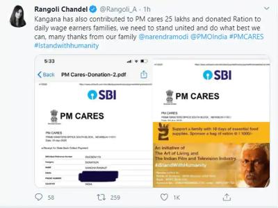 कंगना की बहन रंगोली चंदेल ने ट्विटर पर इसकी जानकारी दी। उन्होंने बताया, ''कंगना ने भी पीएम केयर्स फंड में 25 लाख की मदद की है और दैनिक वेतन भोगियों के परिवारों लिए राशन डोनेट किया है। हमें एकजुट होकर खड़े होने की जरूरत है और जो भी हम अच्छा कर सकते हैं, करें।''