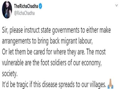 पीएम मोदी के मन की बात के तुरंत बाद बॉलीवुड एक्ट्रेस ऋचा चड्ढा ने अपने ट्वीट अकाउंट से पीएम से अपील की। उन्होंने केंद्र सरकार को राज्य सरकार से फंसे हुए मजदूरों की मदद करने की बात कही।