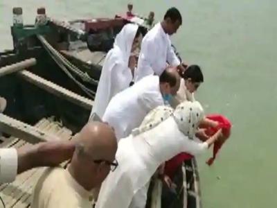 Bihar: Family of actor #SushantSinghRajput immersed his ashes in river Ganga in Patna today. He died by suicide at his residence in Mumbai's Bandra on June 14. pic.twitter.com/Heo6wrrJIQ