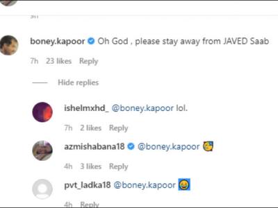 वहीं, 71 वर्षीय अभिनेत्री के पोस्ट पर फैंस के साथ तमाम सेलेब्स भी उनके स्वस्थ होने की कामना कर रहे हैं। जहां जानी-मानी प्रोड्यूसर एकता कपूर ने लिखा, "गेट वेल सून मैम" तो वहीं दिव्या दत्ता लिखती हैं, "गेट वेल सून शबाना जी।" वहीं, शबाना आजमी के इस पोस्ट पर मशहूर फिल्ममेकर बोनी कपूर ने भी कमेंट किया है। उन्होंने कमेंट कर लिखा, "हे भगवान, आप जावेद साहब से प्लीज दूर रहिएगा।" फैंस बोनी कपूर के इस मजाकिया कमेंट को काफी पसंद कर रहे हैं। फिलहाल, शबाना आजमी ने भी पति जावेद अख्तर को लेकर किए गए कमेंट का क्यूट जवाब दिया है।