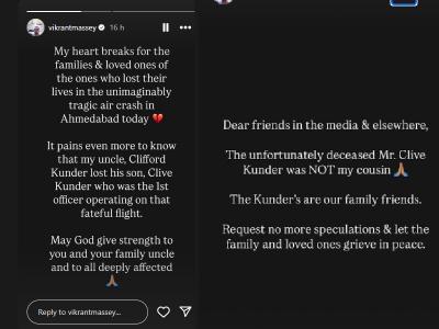 इससे एक दिन पहले विक्रांत ने इस दिल दहला देने वाली घटना पर प्रतिक्रिया व्यक्त की और चिंता व्यक्त करते हुए लिखा कि आज अहमदाबाद में हुए अकल्पनीय रूप से दुखद हवाई दुर्घटना में अपनी जान गंवाने वालों के परिवारों और प्रियजनों के लिए मेरा दिल टूट गया है।