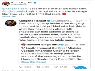 सांसद बिट्टू ने कहा कि मैं कंगना को यह स्पष्ट करना चाहता हूं कि हमारे पंजाबियों बीच सैकड़ों दिक्कतें हो सकती हैं लेकिन हम कभी भी बाहरी लोगों को अपने मामलों में बर्दाश्त नहीं करते हैं। इससे पहले दिलजीत ने लिखा था कि बंदे को इतना अंधा नहीं होना चाहिए। इस पर कंगना बिफर गईं। उन्होंने आपा खो दिया और दिलजीत को करण जौहर का पालतू तक कह दिया।