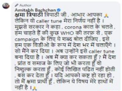 इस पर अमिताभ ने कहा कि उनसे एक कैंपेन के तहत इसमें हिस्सा लेने के लिए कहा गया और उन्होंने मैसेज रिकॉर्ड कर दिया। उन्होंने उस फैन से तकलीफ के लिए माफी भी मांगी। अमिताभ ने लिखा, ''वो कॉलर ट्यून मेरा निर्णय नहीं है। मुझसे सरकार ने कहा, कोरोना काल के चलते हम चाहते हैं कि कुछ डब्ल्यूएचओ की तरफ से एक कैंपेन के लिए ये शब्द बोल दीजिए।