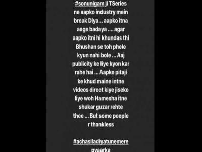 दिव्या ने अपनी बात को आगे जारी रखते हुए कहा कि सोनू निगम जैसे लोग दर्शकों के दिमाग से खेल रहे हैं। भगवान इस दुनिया को बचाए।' दिव्या ने आगे लिखा, 'सोनू निगम जी टी-सीरीज ने आपको इंडस्ट्री में ब्रेक दिया। आपको इतना आगे बढ़ाया। अगर आपको इतनी दिक्कत थी भूषण से तो पहले क्यों नहीं बोले। आज पब्लिसिटी के लिए क्यों कर रहे हैं आप यह सब'।