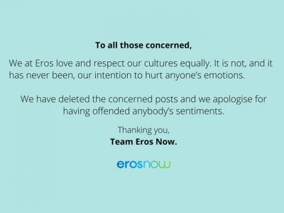 बयान में आगे कहा, 'हमने पोस्ट को डिलीट कर दिया है और हम माफी मांगते हैं अगर हमने किसी की भावनाओं को आहत किया है।' सोशल मीडिया पर #BoycottErosNow ट्रेंड कर रहा था।