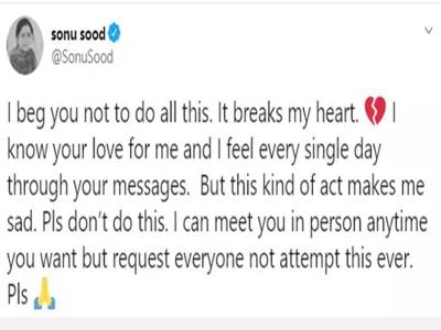 हाल ही में एक शख्स ने सोनू सूद को ट्वीट कर कहा कि उसने अपने हाथ पर खून से उनका नाम लिखवा लिया है। फैन ने सोनू सूद की तरफ अपने प्यार का इजहार किया है। लेकिन फैन की इस हरकत को देखकर सोनू सूद काफी डर गए हैं। उन्होंने एक लंबी पोस्ट के जरिए लोगों से इस तरह की हरत न करने की अपील की। सोनू ने ट्वीट कर कहा- मैं भीख मांगता हूं, आप ऐसा मत कीजिए। ये मेरा दिल तोड़ता है। मुझे पता है कि आप सभी मुझसे प्यार करते हैं। लेकिन ऐसे कदम मुझे दुख देते हैं। आप चाहे तो मैं आप से मिल सकता हूं, लेकिन ऐसा मत कीजिए।