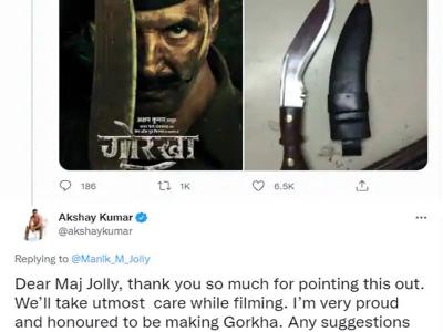 इस गलती पर अक्षय कुमार ने जवाब देते हुए लिखा, प्रिय मेजर जॉली, इसे इंगित करने के लिए बहुत-बहुत धन्यवाद। फिल्म बनाते समय हम अत्यधिक सावधानी बरतेंगे। मुझे गोरखा बनाने पर बहुत गर्व और सम्मान है। इसे वास्तविकता के सबसे करीब लाने के लिए किसी भी सुझाव की सबसे अधिक सराहना की जाएगी।