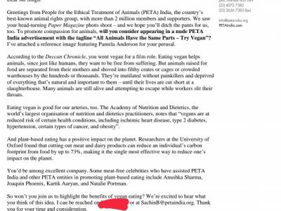 इस संबंध में पेटा इंडिया के सेलिब्रिटी और वाइस प्रेसिडेंट ऑफ सेलेब्रिटी सचिन बंगेरा ने कहा, "इंसानों की तरह जानवर भी मांस, खून और हड्डियों से बने होते हैं। उनके पास भावनाएं होती हैं, वो भी दर्द महसूस करते हैं और अपने परिवार के साथ रहना चाहते हैं। वे मरना नहीं चाहते हैं।"