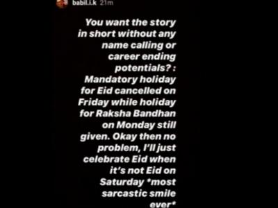 बाबिल ने आगे लिखा है, हर साल ईद पर होने वाली छुट्टी जो इस बार शुक्रवार को थी, कैंसिल कर दी गई है लेकिन सोमवार को रक्षाबंधन के लिए छुट्टी दी गई है। कोई बात नहीं, मैं शनिवार के दिन ईद मनाऊंगा।