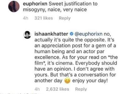 ईशान खट्टर ने अपने सोशल मीडिया अकाउंट पर एक पोस्ट शेयर की है। जिसमें एक्टर ने भाई शाहिद कपूर को उनकी फिल्म के लिए बधाई दी है। इस पोस्ट पर एक यूजर ने लिखा, 'ये एक खूबसूरत जस्टीफिकेशन है, नाइस वेरी नाइस।' इस पोस्ट पर ईशान ने रिप्लाई किया, 'नहीं ऐसा बिल्कुल भी नहीं है। ये इसके बिल्कुल उलट है। वो एक अच्छे इंसान और एक्टर की सराहना करते हुए पोस्ट हैं। फिल्म की बात करूं तो ये सिर्फ एक सिनेमा है। हर किसी की अपनी राय होनी चाहिए। मैं बस आपसे सहमत नहीं हूं।'