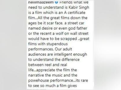 शाहिद कपूर की इस फिल्म पर उनकी मां नीलिमा ने भी अपनी बात रखी। उन्होंने लिखा, 'हमें समझने की जरूरत है कि कबीर सिंह एक ऐसी स्टोरी है जिसे ए सर्टिफिकेट मिला है। शानदार परफॉर्मेंस के साथ ग्रेट फिल्म। यंग जनरेशन रील और रियल लाइफ के बीच के अंतर को समझने के लिए बुद्धिमान है।'