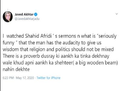 जावेद अख्तर ने ट्वीट कर लिखा है, 'मैंने शाहिद अफरीदी के उपदेश को देखा। यह कितना मजेदार है कि उस आदमी के पास हमें ज्ञान देने का दुस्साहस है कि धर्म और राजनीति को मिश्रित नहीं किया जाना चाहिए। एक कहावत है कि दूसरे की आंख का तिनका दिखाने वाले खुद अपनी आंख का शीतर नहीं देखते।'