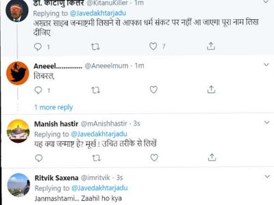 दरअसल, जावेद अख्तर ने फैंस को बधाई तो दिया लेकिन उन्होंने कृष्ण जन्माष्टमी को पूरा नहीं लिखा। जावेद ने सिर्फ हैप्पी जनमास... लिखकर फैंस को शुभकामनाएं दी। जिसके बाद नाराज फैंस ने जावेद अख्तर को ट्रोल करना शुरू कर दिया। एक यूजर ने इस पर कमेंट करते हुए लिखा है कि.. जन्माष्टमी लिखने से आपका धर्म संकट में नहीं आएगा। पूरा लिख दीजिए।