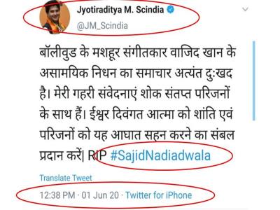 इस ट्वीट में यहां तक तो सब ठीक था लेकिन हैशटैग देने में वह बड़ी चूक कर गए। उन्होंने वाजिद खान की जगह बॉलीवुड के एक जानेमाने प्रोड्यूसर साजिद नाडियाडवाला का नाम लिख दिया। 12 बजकर 38 मिनट पर किया यह ट्वीट जैसे ही लोगों के सामने आया लोगों ने उन्हें जमकर ट्रोल करना शुरू कर दिया। इसके बाद ज्योतिरादित्य सिंधिया ने इसे डिलीट कर दोबारा पोस्ट किया।