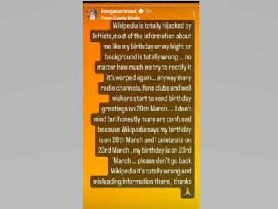 कंगना रनौत ने अपने इंस्टाग्राम स्टोरी में पोस्ट करते हुए लिखा, "विकिपीडिया पर वामपंथियों ने पूरी तरह से कब्जा कर लिया है, मेरे बारे में ज्यादातर जानकारी जैसे मेरा जन्मदिन और मेरी ऊंचाई, पृष्ठभूमि जैसी सारी जानकारियां पूरी तरह से गलत है, मैं इसे कितना भी सुधारने की कोशिश करें, यह फिर से गलत हो जाता है...वैसे भी कई रेडिया चैनल, फैन क्लब और मेरे प्रिय लोग 20 मार्च को मुझे जन्मदिन की बधाइयां देते हैं।"
