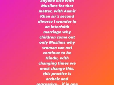 कंगना ने आमिर खान के तलाक पर हैरानी जताई है। एक्ट्रेस ने आगे लिखा, आमिर खान के तलाक के बाद मुझे ताज्जुब हुआ कि अंतरधार्मिक विवाह में बच्चे हमेश मुस्लिम ही क्यों बनते हैं। क्यों आखिर महिलाएं हिंदू नहीं बनी रह पाती हैं।