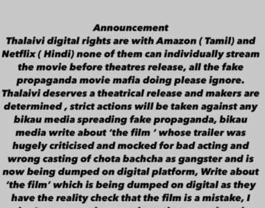 कंगना रनौत ने अपनी इंस्टाग्राम स्टोरी पर एक पोस्ट शेयर करते हुए लिखा, 'थलाइवी के डिजिटल स्ट्रीमिंग का अधिकार अमेजॉन (तमिल) और नेटफिलक्स (हिंदी ) के पास है। इन दोनों में से कोई भी थलाइवी को सिनेमाघरों में रिलीज होने से पहले अलग-अलग स्ट्रीम नहीं कर सकते है। थलाइवी एक शानदार रिलीज की हकदार है और निर्माताओं ने ऐसा ही तय किया है। बिकाऊ मीडिया के फेक प्रोपेगेंडा के खिलाफ सख्त कार्रवाई की जाएगी।'