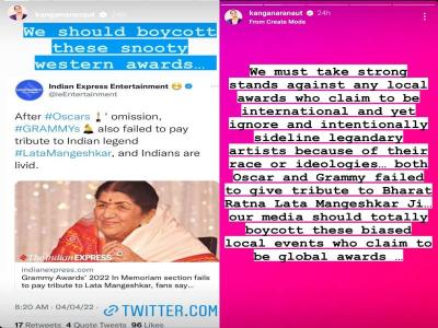 एक्ट्रेस ने आगे लिखा कि ऑस्कर और ग्रैमी दोनों ही भारत रत्न लता मंगेशकर जी को श्रद्धांजलि देने में विफल रहे। हमारे मीडिया को इन पक्षपाती स्थानीय आयोजनों का पूरी तरह से बहिष्कार करना चाहिए जो वैश्विक पुरस्कार होने का दावा करते हैं। अपनी बात को जारी रखते हुए कंगना रनौत ने ये भी लिखा कि हमें इन अजीबोगरीब पश्चिमी पुरस्कारों का बहिष्कार करना चाहिए। ग्रैमी अवॉर्ड्स के इन मेमोरियम सेगमेंट ने कई दिवंगत संगीत दिग्गजों को श्रद्धांजलि दी। हालांकि, दिवंगत महान भारतीय गायिका लता का नाम खंड से गायब था।