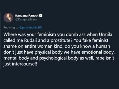 एक यूजर द्वारा आपत्ति जताने के बाद कंगना ने इसका जवाब देते हुए ट्वीट किया- ''तुम्हारा नारीवाद उस समय कहां चला गया था, जब उर्मिला ने मुझे रूदाली और वैश्या कहा था। तुम जैसे फर्ज़ी नारीवादी पूरे नारी समाज को शर्मसार करते हो। क्या तुम्हें पता है कि एक इंसान का सिर्फ भौतिक शरीर नहीं होता, बल्कि मानसिक और मनोवैज्ञानिक शरीर भी होता है, यौन दुष्कर्म सिर्फ़ शारीरिक संबंध नहीं होता।'