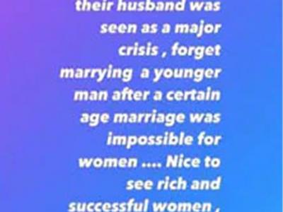 बतादें कि कंगना रनौत ने अपनी इंस्टाग्राम स्टोरी पर पोस्ट शेयर करते हुए लिखा - ‘हमने अब तक सफल अमीर पुरुषों को कम उम्र की महिलाओं से शादी करते सुना है। महिलाएं पुरुषों से ज्यादा सफल हो तो मुश्किल के तौर पर इसे देखा जाता था। लेकिन अब भारतीय फिल्म उद्योग की अमीर और सफल महिलाओं को सेक्सिएस्ट मानदंडों को तोड़ते देख काफी अच्छा लगा। महिलाओं और पुरुषों दोनों को इसकी बधाई।’