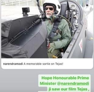 प्रधानमंत्री नरेंद्र मोदी के तेजस में उड़ान भरने को लेकर कंगना रनौत ने सोशल मीडिया प्लेटफॉर्म इंस्टाग्राम पर कहा कि पीएम ने तेजस में उड़ान भरने से पहले उनकी फिल्म 'तेजस' देखी होगी।