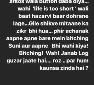 फिल्म निर्माता करण जौहर ने अपने इंस्टाग्राम स्टोरी में लिखा- "कोई गुज़र गया... फिर आपने अफसो वाला बटन दबा दिया... वही 'ज़िन्दगी बहुत छोटी है' वाली बात हज़ारवी बार दोहराने लगे... गिले शिकवे मिटाने का ज़िक्र भी हुआ... फिर अचानक आपने अपने बारे में बिचिंग सुनी और आपने भी वही किया! बिचिंग! वाह! जनाब लोग गुजर जाते हैं ... रोज़ ... पर हम कौनसा जिंदा है?