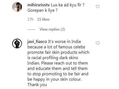 एक यूजर ने लिखा- भारत में स्थिति और भी खतरनाक है क्योंकि बहुत सारे प्रसिद्ध सेलेब्स निष्पक्ष त्वचा उत्पादों को बढ़ावा देते हैं। जो कि नस्लीय भेदभाव को दर्शाता है। कृपया उनके पास पहुंचें और उन्हें शिक्षित करें और ऐसे विज्ञापनों को बढ़ावा देना बंद करें। अपनी त्वचा के रंग में खुश रहें। एक अन्य यूजर ने लिखा- फिर गोरेपन का विज्ञापन क्यों किया था?
