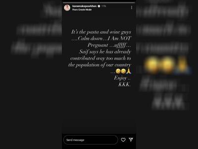 करीना इन दिनों अपने पति सैफ अली खान और बेटों तैमूर और जेह के साथ यूरोप में छुट्टियां मना रही हैं। छुट्टियों से उनकी एक तस्वीर वायरल हो गई, जिसमें दावा किया गया कि इसमें बेबी बंप दिखाई दे रहा है। ऐसे में खबरों का खंडन करते हुए करीना ने अपनी इंस्टाग्राम स्टोरीज पर एक नोट पोस्ट किया। एक्ट्रेस ने लिखा, "यह पास्ता और वाइन है दोस्तों...शांत हो जाओ...मैं गर्भवती नहीं हूं...उफ्फ...सैफ का कहना है कि उन्होंने पहले ही हमारे देश की आबादी के लिए बहुत अधिक योगदान दिया है...आनंद लें...केकेके।"