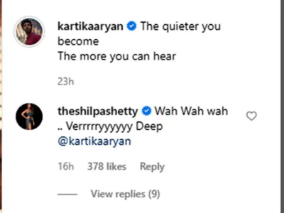 ऐसे में इस फोटो पर एक्ट्रेस शिल्पा शेट्टी भी कमेंट करने से खुद को नहीं रोक पाई हैं। शिल्पा शेट्टी ने कमेंट किया 'वाह वाह वाह, वेरी डीप'। शिल्पा शेट्टी के कमेंट से ऐसा लग रहा है कि कार्तिक आर्यन के कैप्शन और फोटो से खुद शिल्पा शेट्टी भी बहुत प्रभावित हुई हैं।