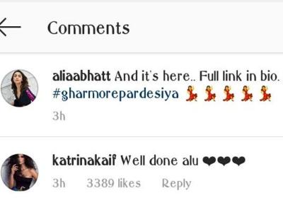 कैटरीना ने सिर्फ आलिया के डांस की तारीफ ही नहीं की बल्कि आलिया भट्ट के बर्थडे पर उन्हें स्पेशल विश भी किया था। आलिया ने अपनी फिल्म कलंक के नए गाने घर मोरे परदेसिया को अपने सोशल मीडिया पर शेयर किया है। इसी वीडियो पर कैटरीना ने कमेंट किया है। कैटरीना ने लिखा है, 'वेल डन आलू' बता दें कैटरीना कैफ, आलिया भट्ट को आलू बुलाती हैं।
