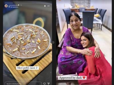 Kriti Kharbanda-Pulkit Samrat: बॉलीवुड के न्यूलीवेड कपल कृति खरबंदा और पुलकित सम्राट इन दिनों परिवार के साथ यादगार पल बीता रहे हैं। शादी के बाद कृति खरबंदा पुलकित के परिवार संग ससुराल में हैं। कृति ने आज अपने ससुराल में पहली रसोई की झलकियां फैन्स को दिखाई। उन्होंने सोशल मीडिया पर फोटो शेयर कर फैन्स के साथ अपनी खुशियां साझा की। एक्ट्रेस ने एक के बाद एक तीन तस्वीरें साझा की जिसमें सबसे पहली तस्वीर में कृति ने सूजी के हलवे की फोटो साझा की उसके बाद दूसरी तस्वीर में वह हलवा सर्व करती दिखीं। वहीं, तीसरी तस्वीर में उन्हें दादी सास के साथ देखा गया जो कि उन्हें आशीर्वाद दे रही है। फोटो शेयर करने के साथ कृति ने लिखा, "मेरी पहली रसोई।"